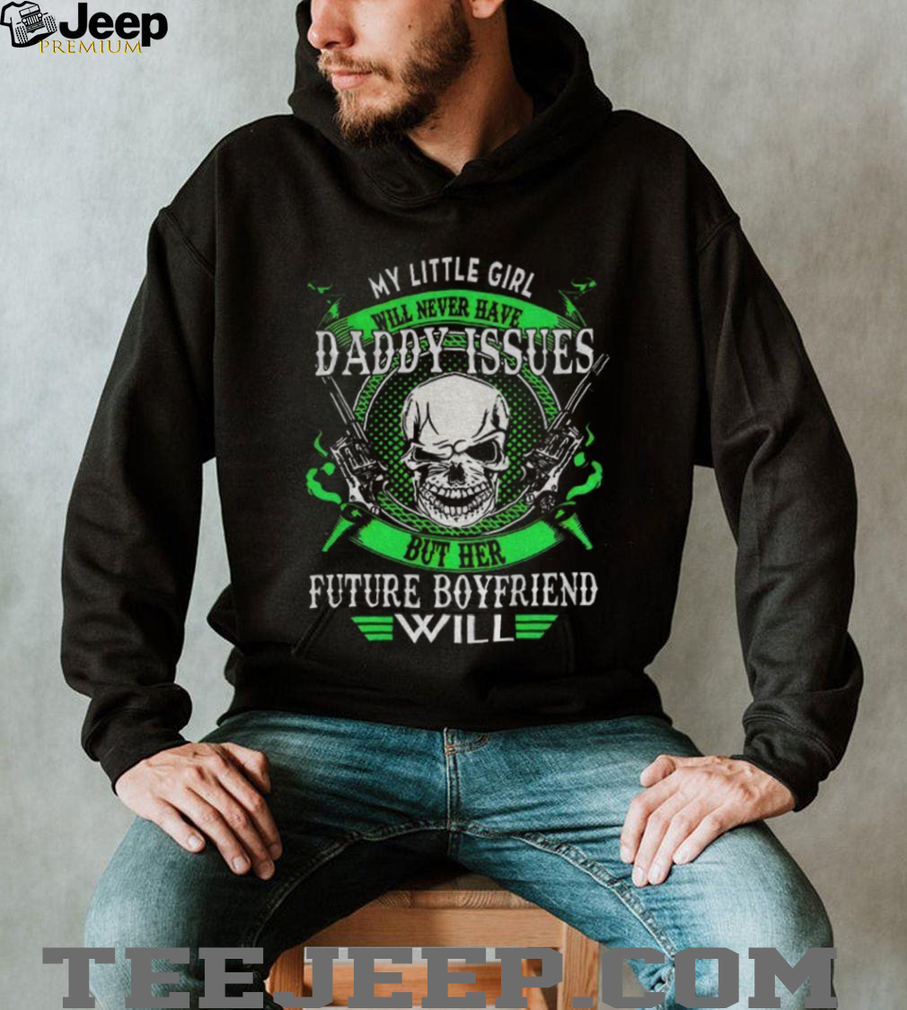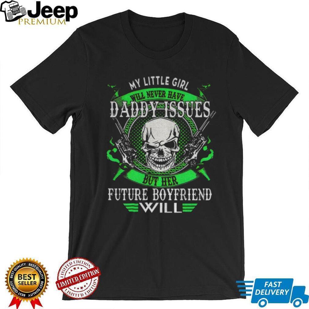 To keep your “Skull Gun My Little Girl Will Never Have Daddy Issues But Her Future Boyfriend Will Shirt” looking its best, machine wash cold with like colors, inside out. Tumble dry low or hang dry. Do not iron directly on the design.