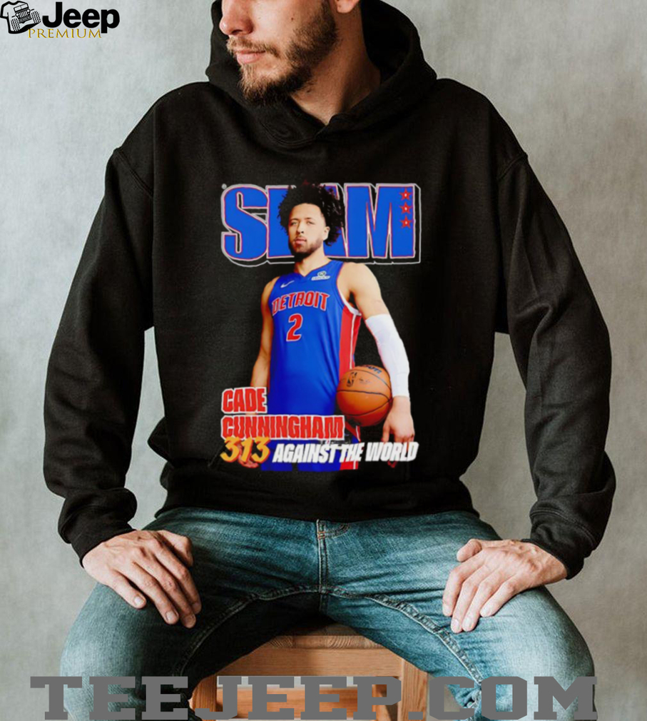 A “Slam Cade Cunningham 313 against the world shirt” is a piece of fan apparel that likely commemorates a SLAM Magazine cover or feature story about Cade Cunningham, a star player for the Detroit Pistons. The number “313” is the area code for Detroit, signifying local pride and a connection between Cunningham and the city. The phrase “against the world” suggests an underdog mentality or a sense of Cunningham and the Pistons battling against external expectations. Given Cunningham’s status as a key player for Detroit, averaging around 25.9 points and 9.1 assists per game in the 2024-2025 season, such a shirt would resonate with Pistons fans who see him as the cornerstone of their team.