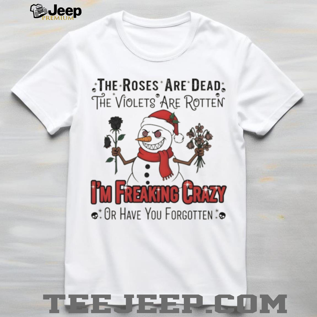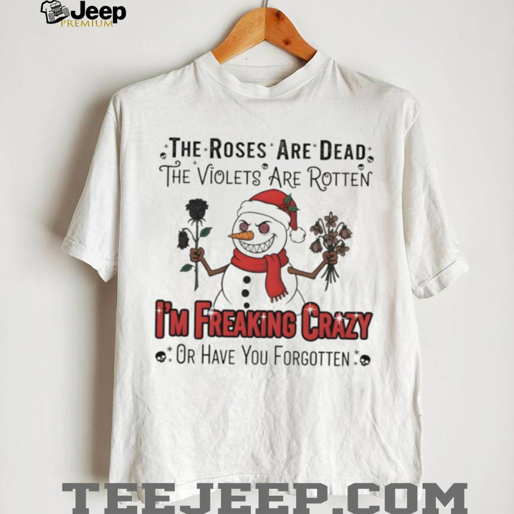 What Makes This Snowman Santa the roses are dead the violets are rotten I’m freaking crazy or have you forgotten Christmas shirt Epic