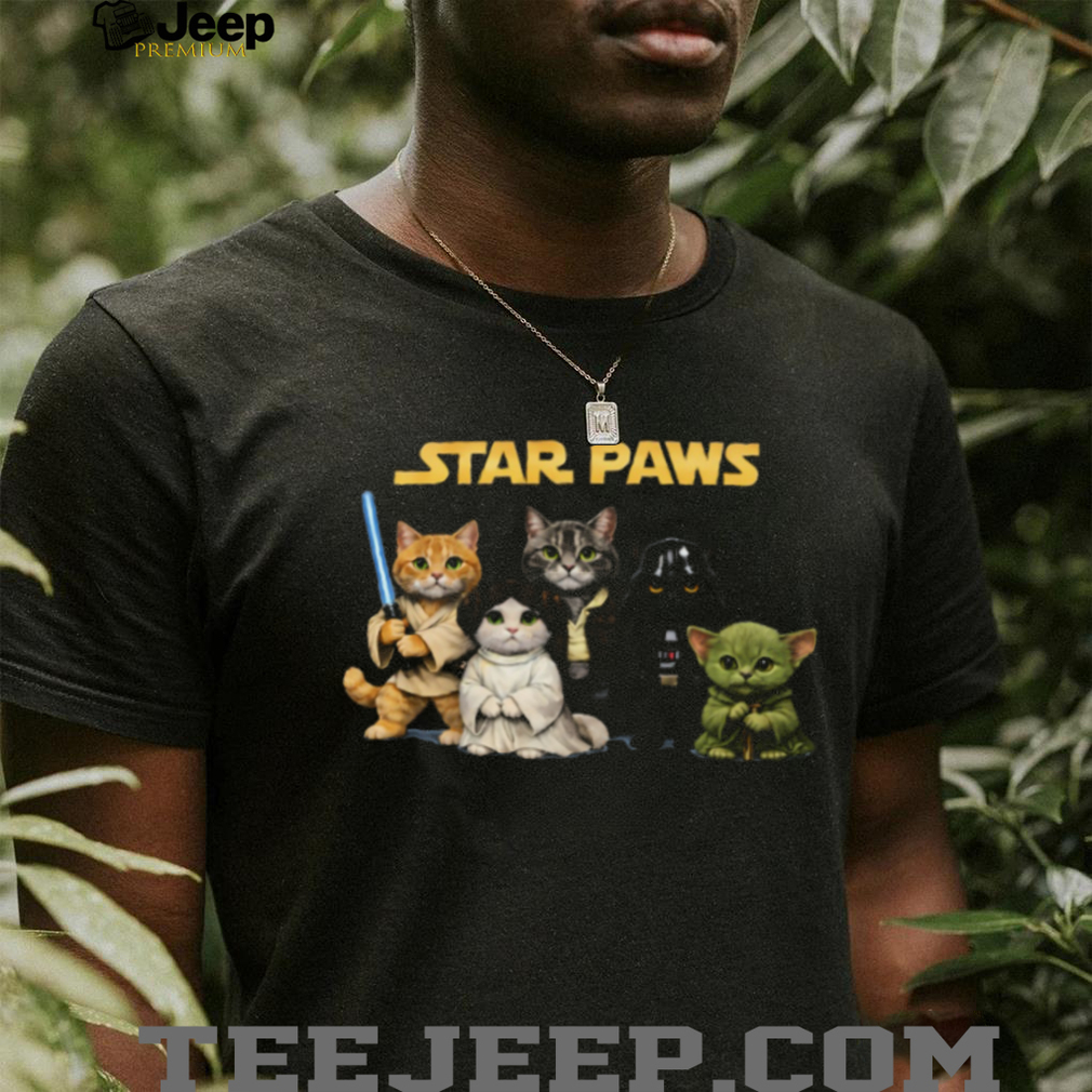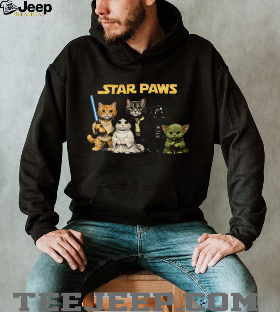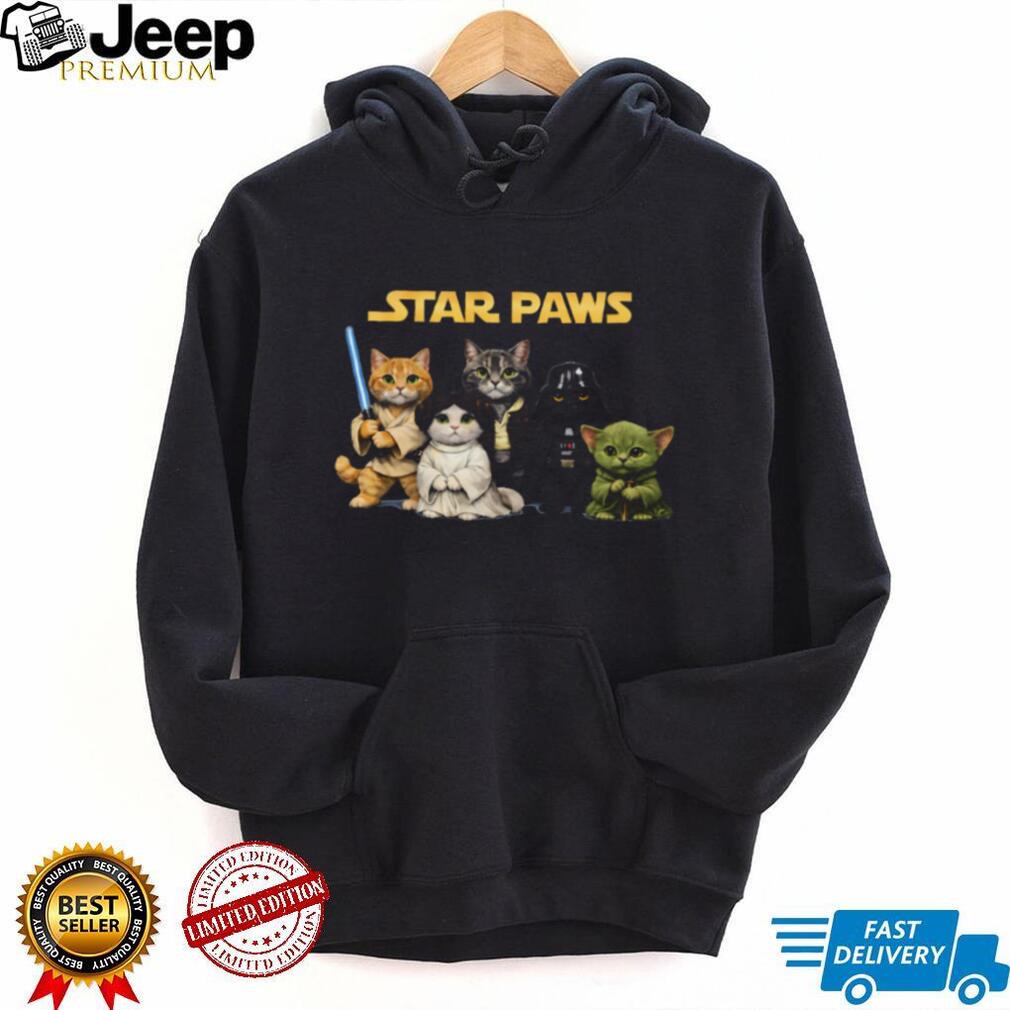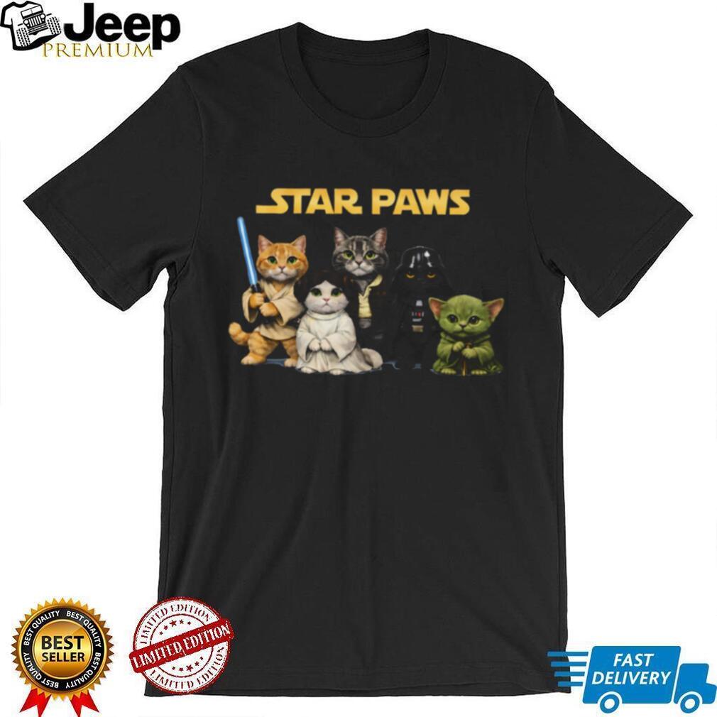 A galaxy far, fur away — Star Paws brings your favorite space saga characters to life as cats! This funny parody tee is a must for cat lovers who are also Star Wars fans.