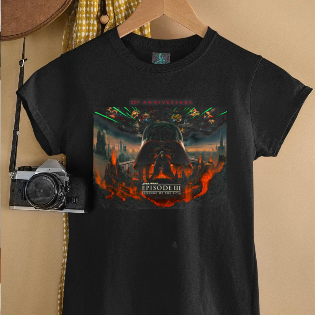 As a 20th-anniversary item, this t-shirt also holds collectible value for Star Wars enthusiasts. It marks a specific milestone in the history of the franchise and of this particular film. Fans who own such a shirt can see it as a piece of memorabilia that commemorates this anniversary year. The design might incorporate special 20th-anniversary branding or artwork, further enhancing its appeal as a nostalgic item that celebrates the enduring legacy of Revenge of the Sith and its continued relevance within the Star Wars fandom two decades after its release.