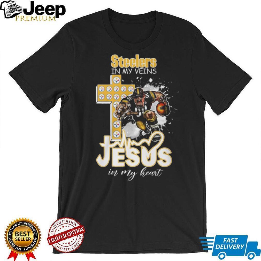 To keep your Steelers In My Veins Jesus In My Heart T Shirt vibrant, wash it inside out in cold water with similar colors. Tumble dry on low heat or air dry. Avoid direct ironing on the design.