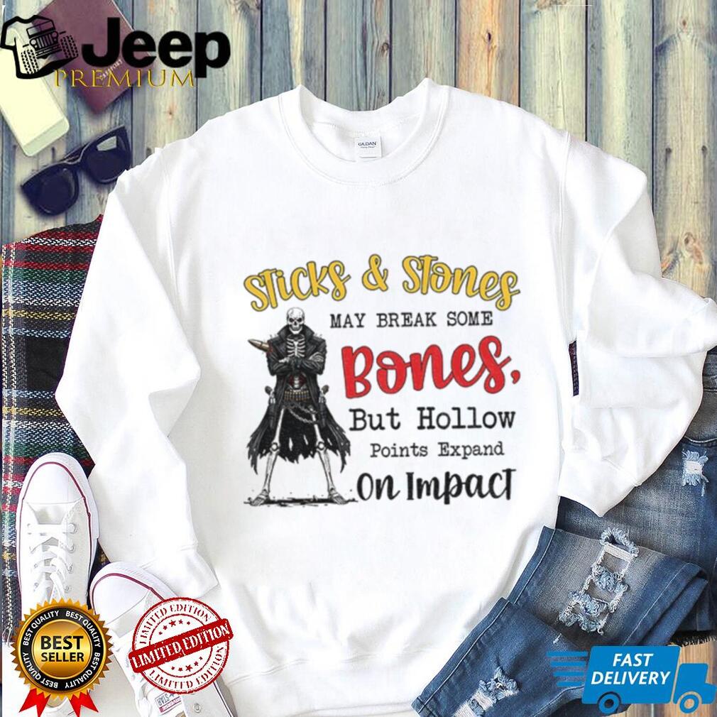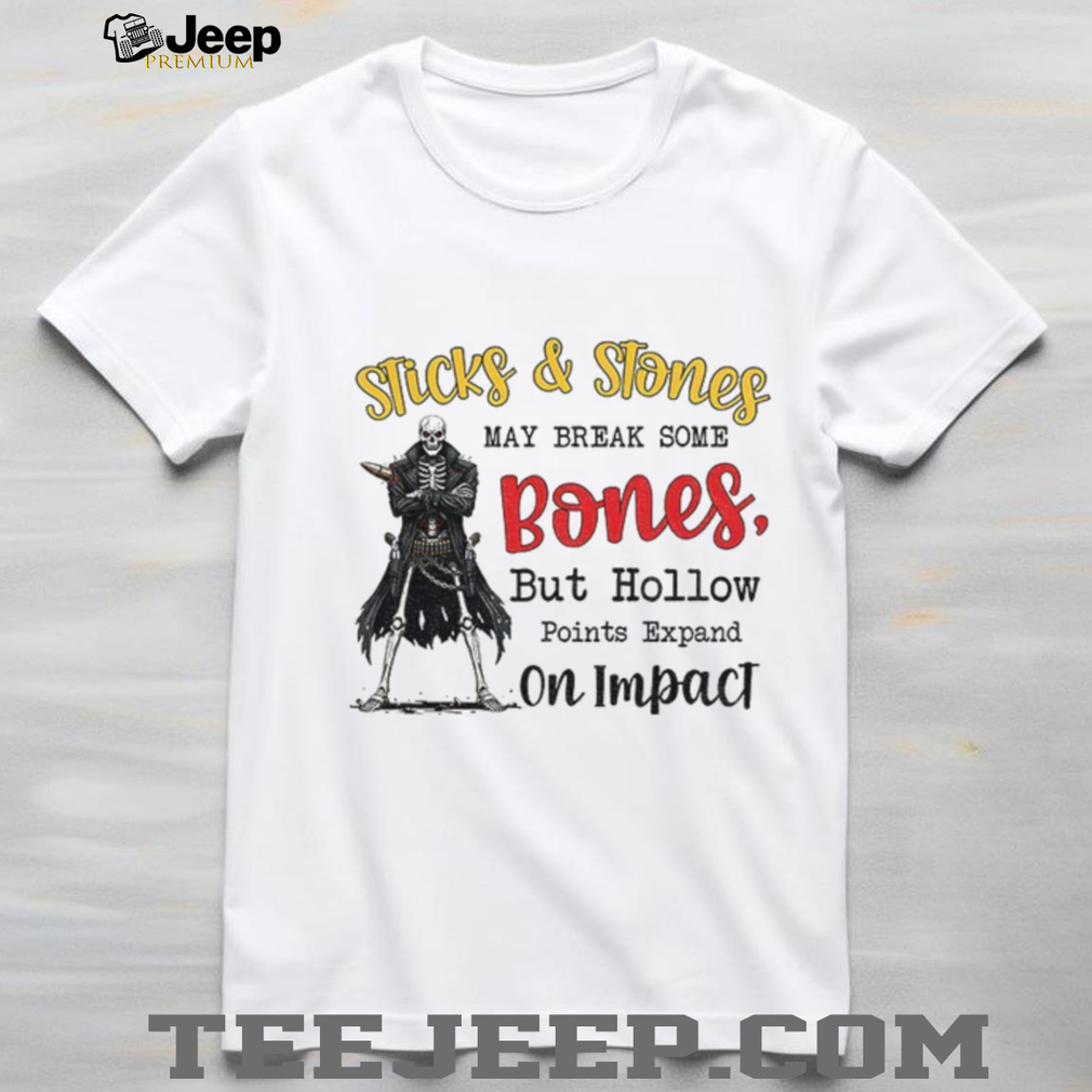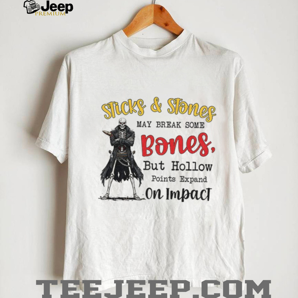 This ‘Sticks and stones may break some bones but hollow points expand on impact’ skeleton shirt is perfect for gun enthusiasts, individuals with a sarcastic streak, or anyone who enjoys thought-provoking apparel. It makes a memorable gift for friends or family members who appreciate a blend of humor and a bit of edge in their wardrobe. Wear it to express your individuality, spark discussions, or simply enjoy a comfortable tee that truly reflects your personality.