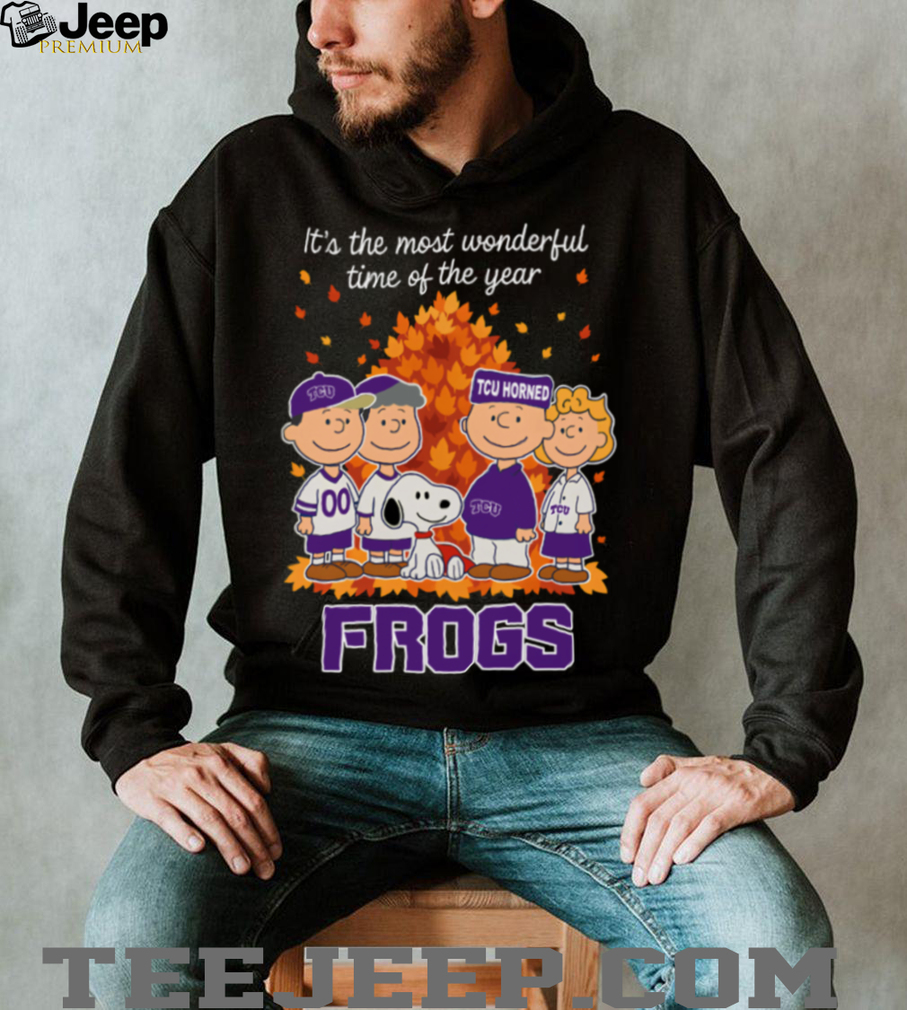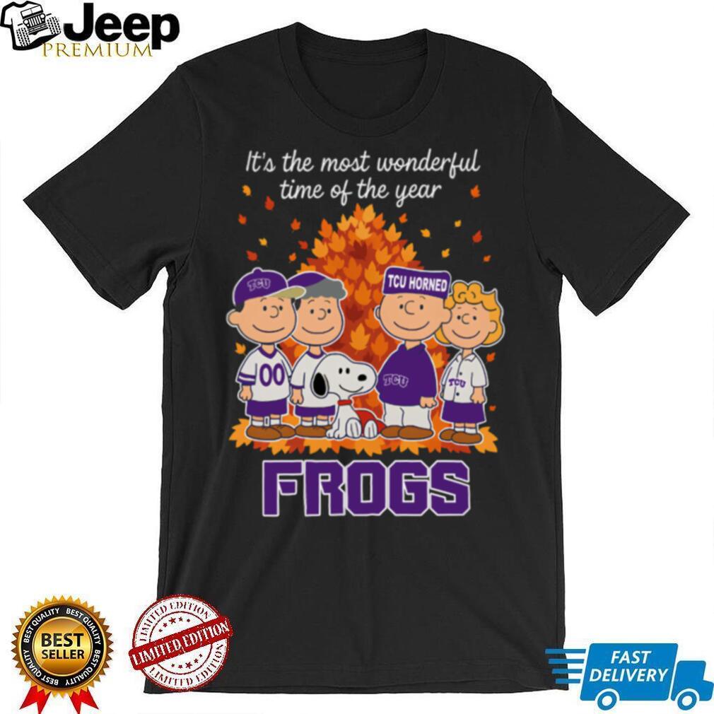 Get ready for fall in Fort Worth with football, fun, and the Peanuts gang! Celebrate the season with this unique TCU Horned Frogs “It’s The Most Wonderful Time Of The Year” T-shirt featuring Snoopy and Charlie Brown in their TCU best. It’s the perfect way to show your team spirit and love for a timeless cartoon. Perfect for game days!