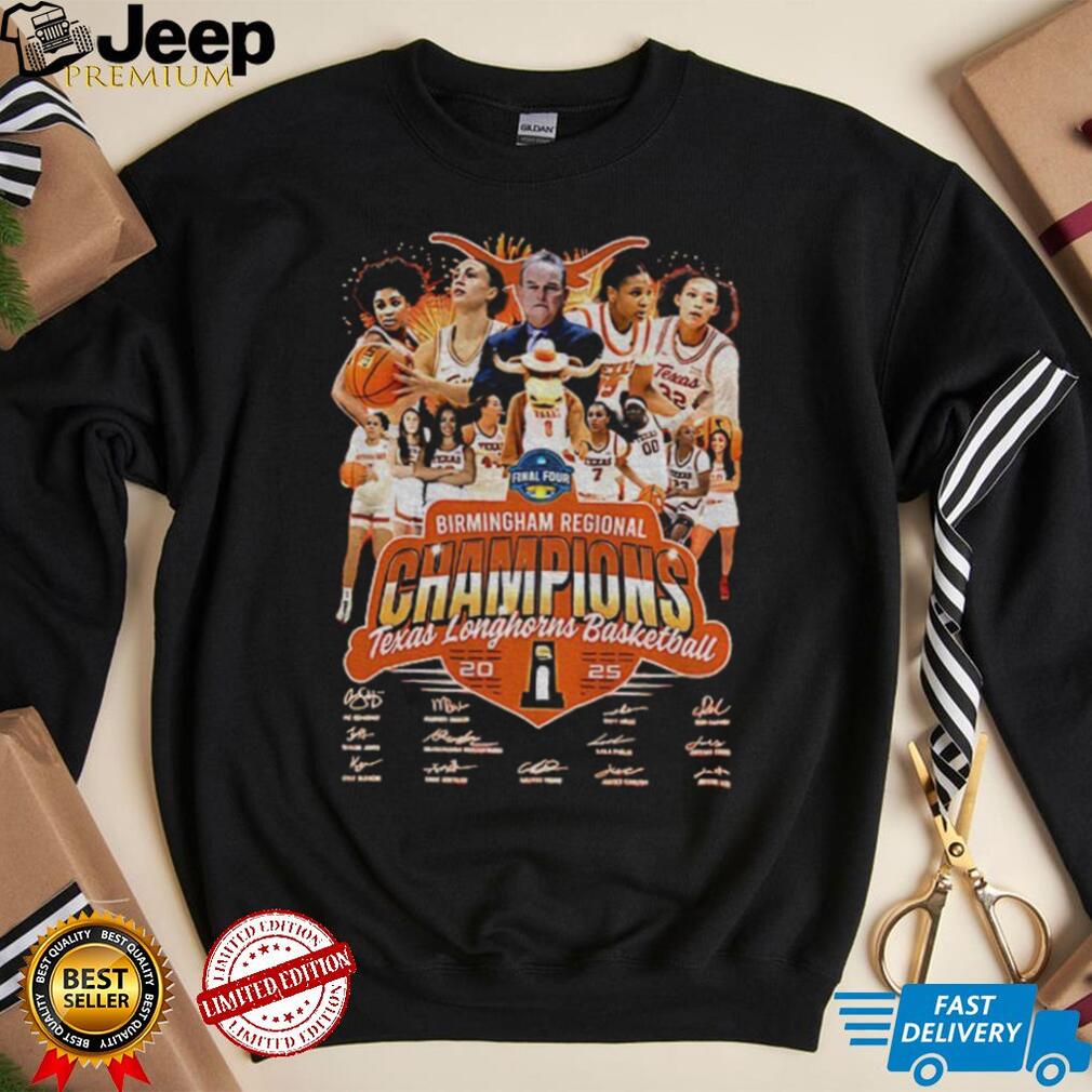 The “Texas Longhorns 2025 Women’s Basketball Final Four Birmingham Regional signatures shirt” is a piece of apparel designed to commemorate a hypothetical achievement by the Texas Longhorns women’s basketball team, reaching the Final Four of the 2025 NCAA Women’s Basketball Tournament, with their regional victory occurring in Birmingham. This shirt serves as a celebratory item for Texas Longhorns fans, marking a significant milestone in the team’s history and expressing excitement for their journey to the Final Four. The design prominently features the year “2025,” the phrase “Final Four,” the location “Birmingham Regional,” and likely includes signatures of key team members.