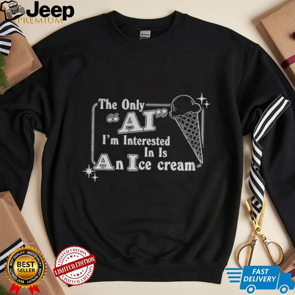 The “The only AI I’m interested in is an ice cream shirt” is a piece of apparel that uses humor and wordplay to express a preference for simple pleasures over complex technology. This shirt aims to playfully reject the current buzz around artificial intelligence (AI), substituting it with a more relatable and universally enjoyed concept: ice cream. It’s a lighthearted take on the tech-heavy conversations prevalent in modern society. The design prominently features the quoted phrase.