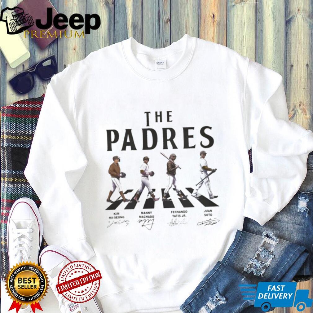 The “SD Padres Baseball Team Abbey Road Album Concept signature shirt” is a piece of fan apparel that cleverly reimagines the iconic cover of The Beatles’ “Abbey Road” album, replacing the band members with San Diego Padres baseball players. This concept aims to blend the worlds of music and sports, creating a unique and visually appealing design that resonates with fans of both the Padres and the legendary rock band. The inclusion of signatures suggests that the players themselves may have been involved in or have endorsed this creative concept, adding a special touch of authenticity for fans. The design would prominently feature San Diego Padres players in the famous “Abbey Road” crossing scene.
