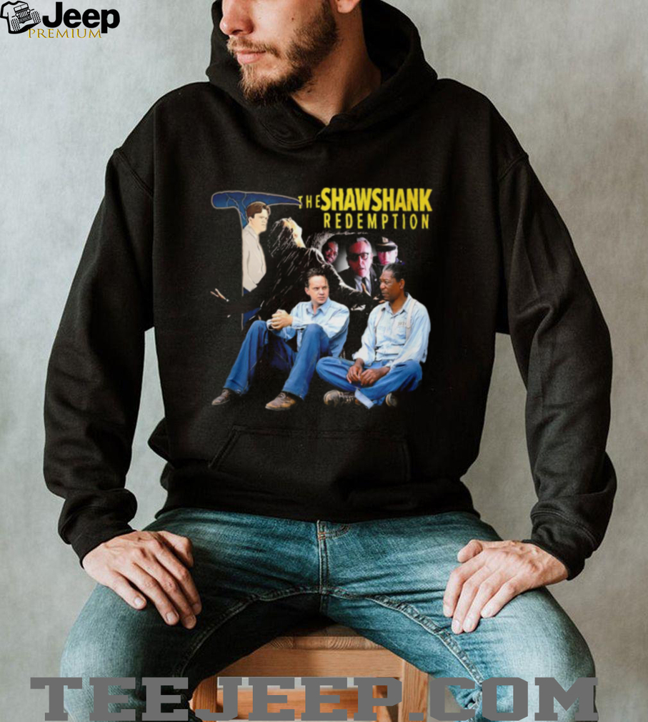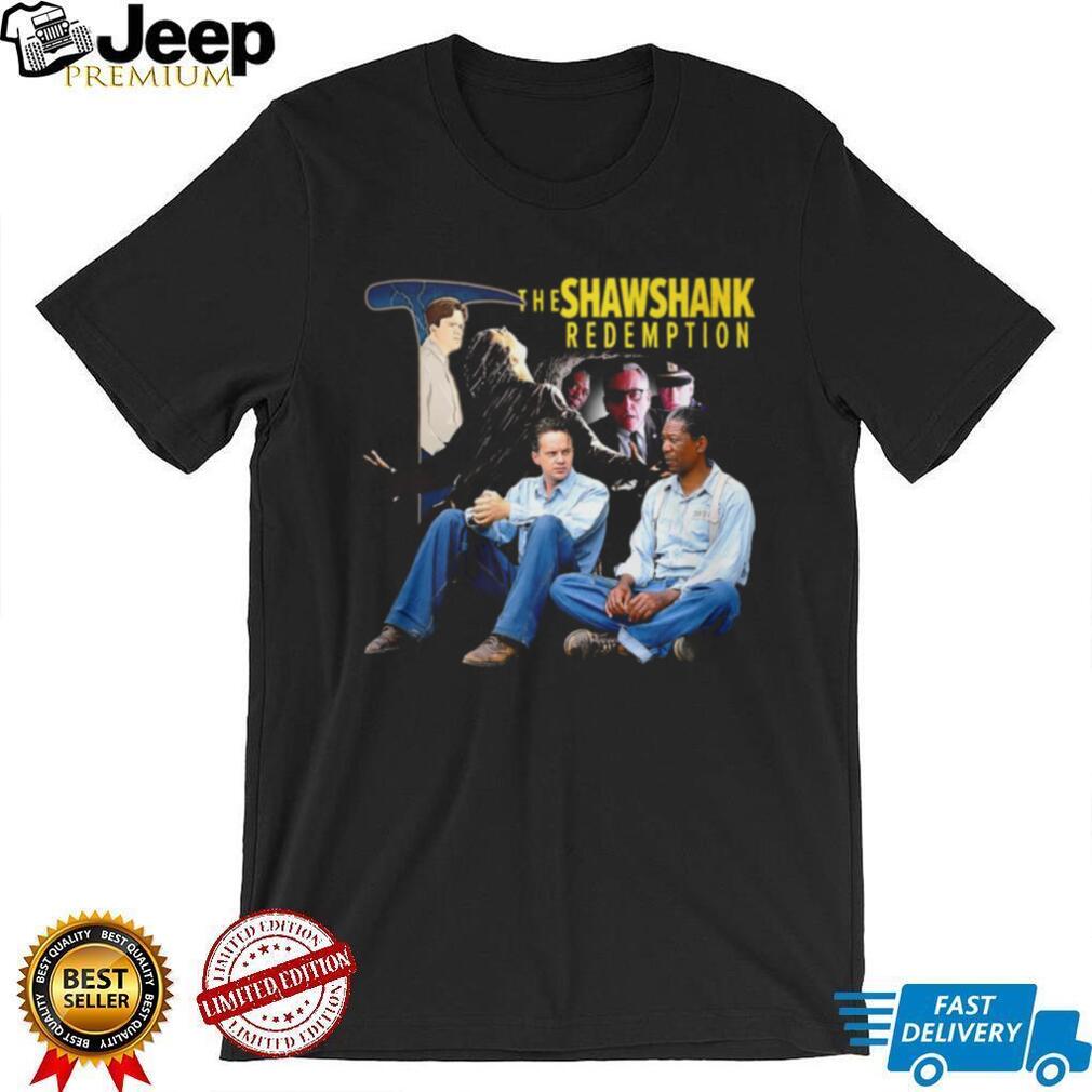 Unlike simple logo tees, this design utilizes a rich “movie poster” collage style, blending the faces of the cast with a sepia-toned, nostalgic aesthetic. It feels like a piece of history, honoring the acting legends Tim Robbins and Morgan Freeman through a detailed art style that looks sophisticated and timeless, much like the film itself.