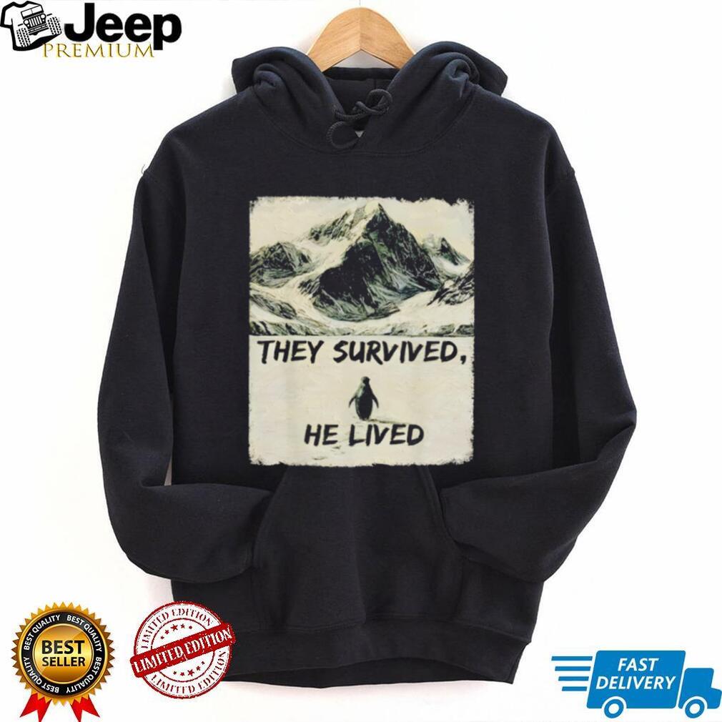 (“They Survived, He Lived” Penguin Mountain Landscape T Shirt)“They Survived, He Lived” Penguin Mountain Landscape T Shirt, Treat yourself or make a great gift for your loved ones