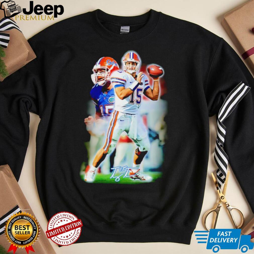 The design of the “**Tim Tebow Florida Gators signature shirt**” is crafted to immediately connect fans to the legendary quarterback. Typically made from high-quality, comfortable cotton, the shirt ensures a great fit for game day or casual wear. The prominent placement of **Tim Tebow’s signature** often adds a touch of personalized memorabilia, even if it’s a printed rendition. The colors are authentically **Florida Gators** orange and blue, instantly recognizable to any college football enthusiast.