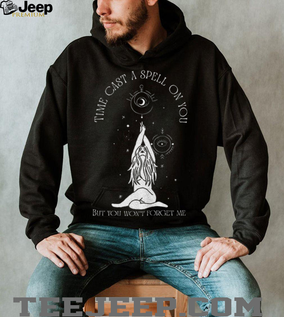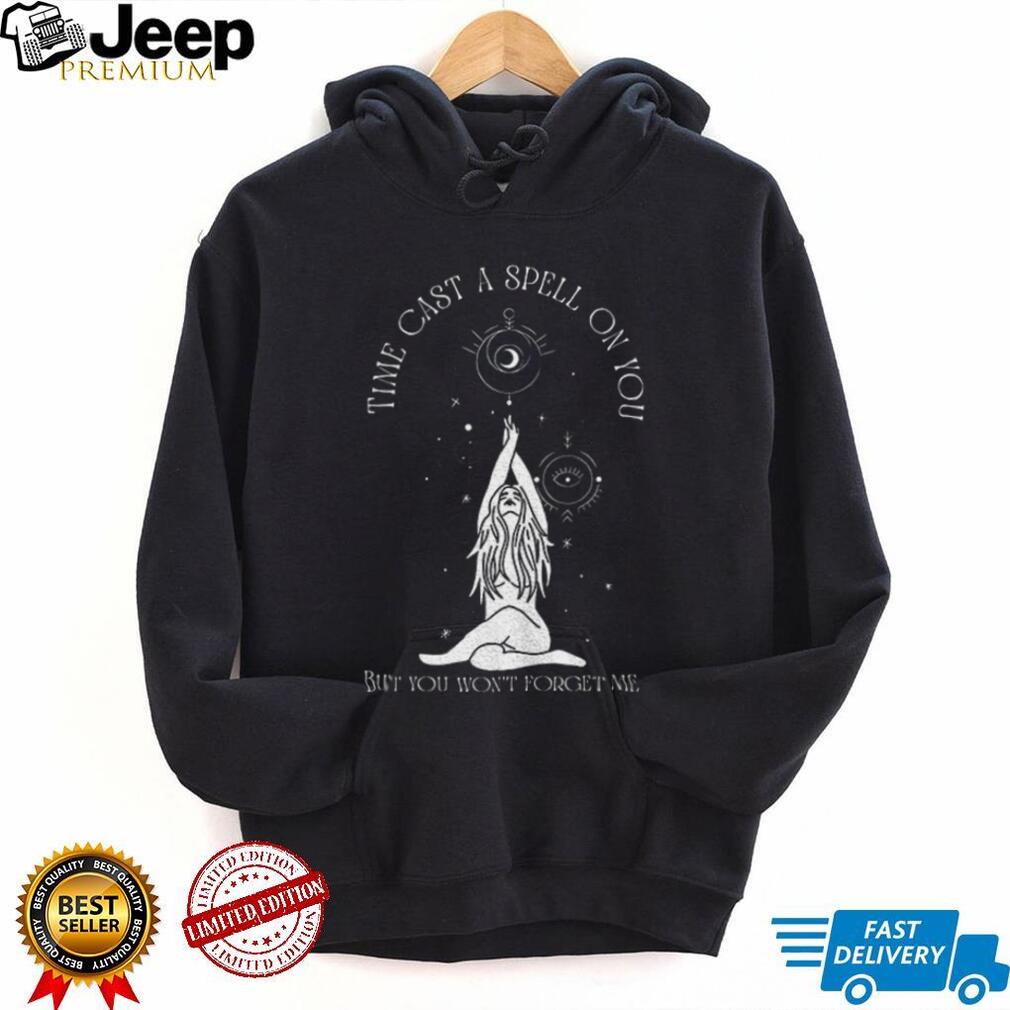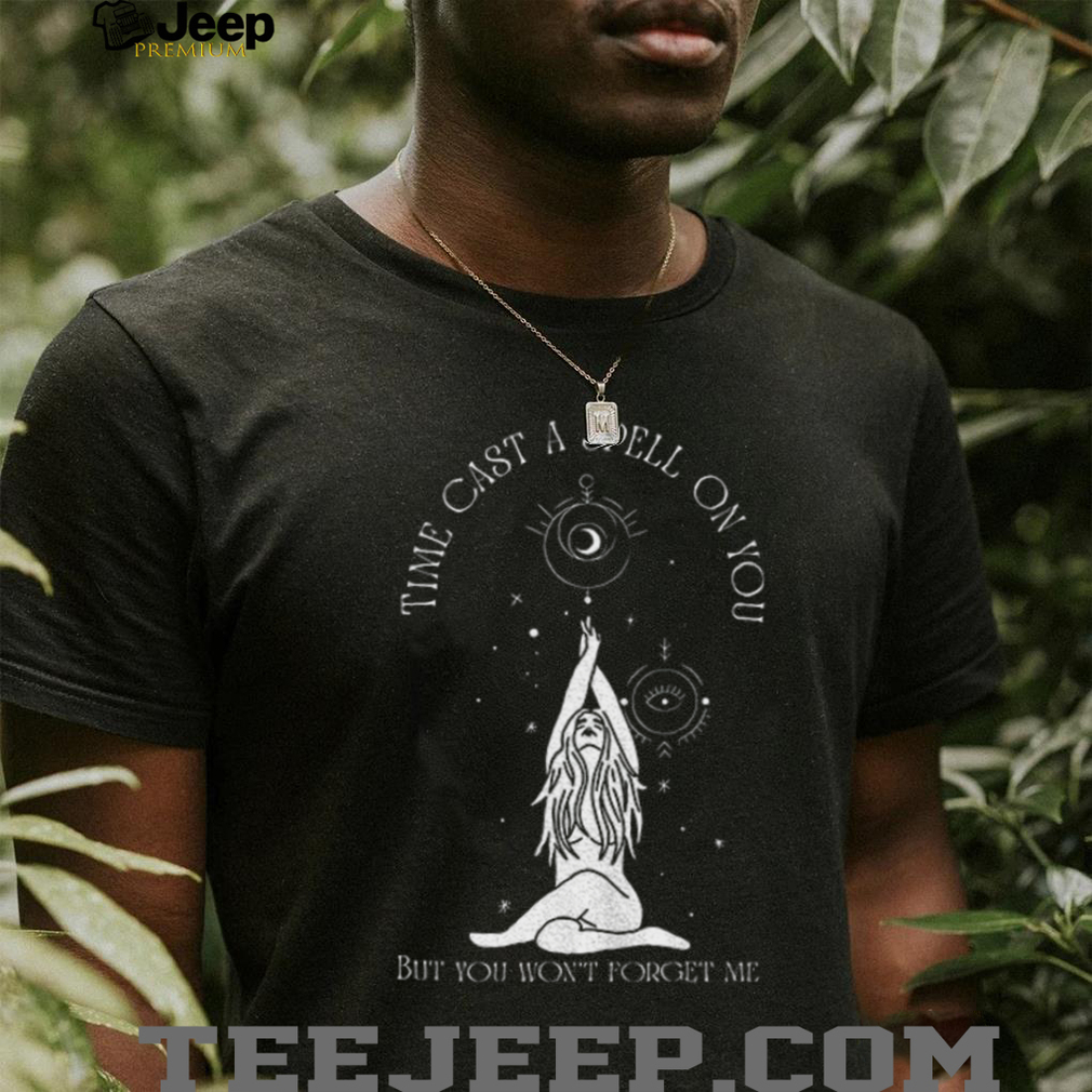 - What specific imagery or symbolic elements beyond the text would enhance the “spell” aspect of the phrase “**Time cast a spell on you but you won’t forget me**” on this **shirt**?