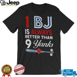 Fuel the rivalry with this hilarious “1 BJ Is Always Better Than 9 Yanks” shirt! Perfect for Toronto Blue Jays fans who love to playfully tease the New York Yankees. Wear it with pride and show your team spirit with a touch of humor!