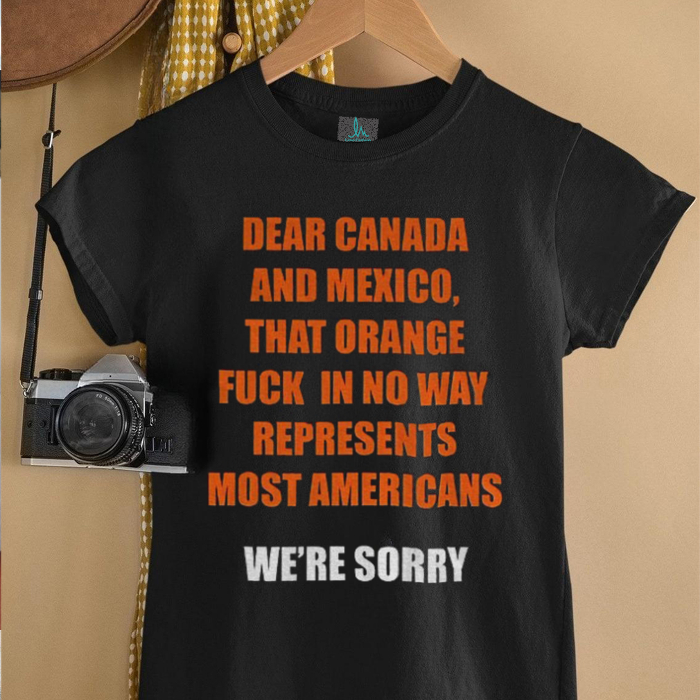 A “Trump Tariffs dear Canada and Mexico that orange fuck in no way represent most Americans anti Trump shirt” is a highly charged political statement aimed at both foreign leaders and a domestic figure. The shirt’s message directly addresses Canada and Mexico, acknowledging the potential strain that tariff policies enacted by a former US president might have placed on their relationships. The phrase “that orange fuck” is a derogatory and inflammatory reference to the former president, Donald Trump. The shirt’s primary message is to assure these neighboring countries that the policies and rhetoric of the former president do not reflect the views of a significant portion of the American populace.