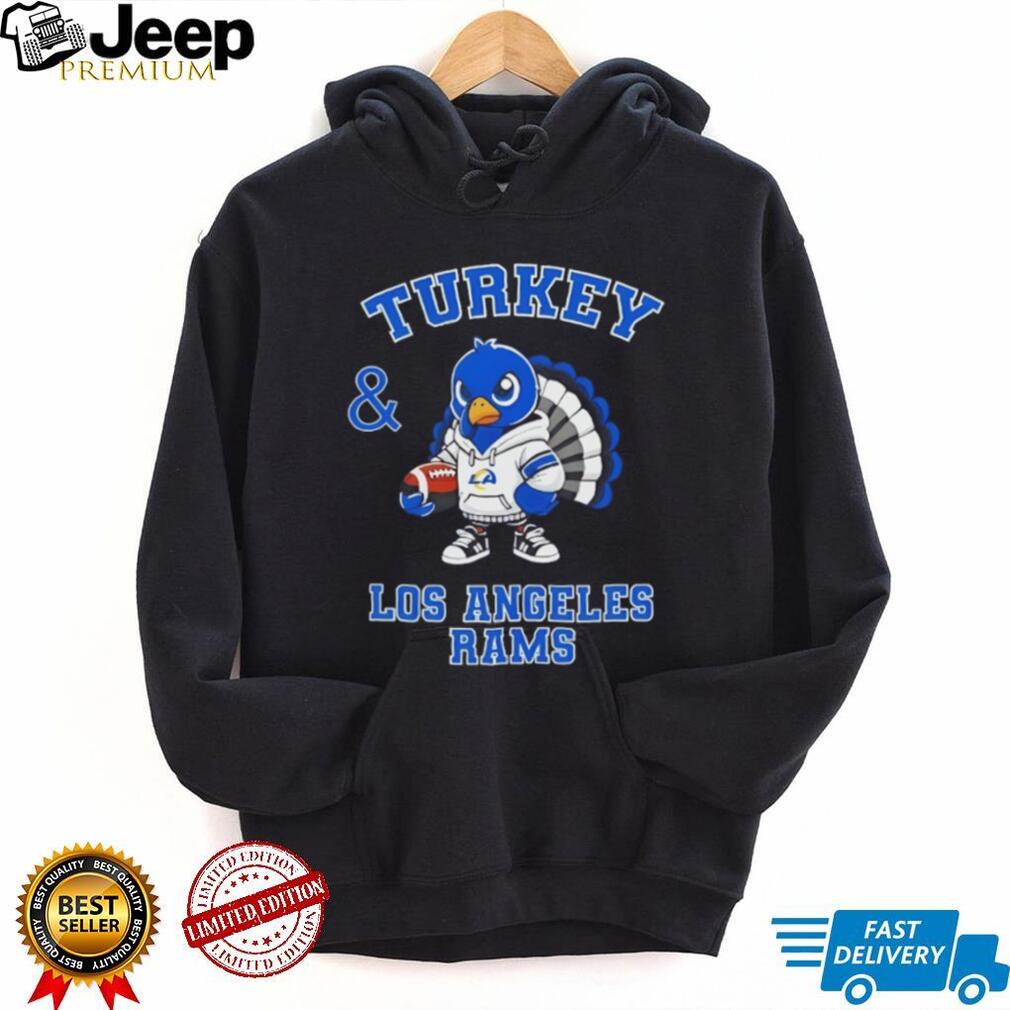 To keep your Turkey and Los Angeles Rams Football NFL Happy Thanksgiving shirt in top condition, machine wash it inside out in cold water with similar colors. Tumble dry on low heat or hang dry to preserve the print and fabric quality. Avoid ironing directly on the design.