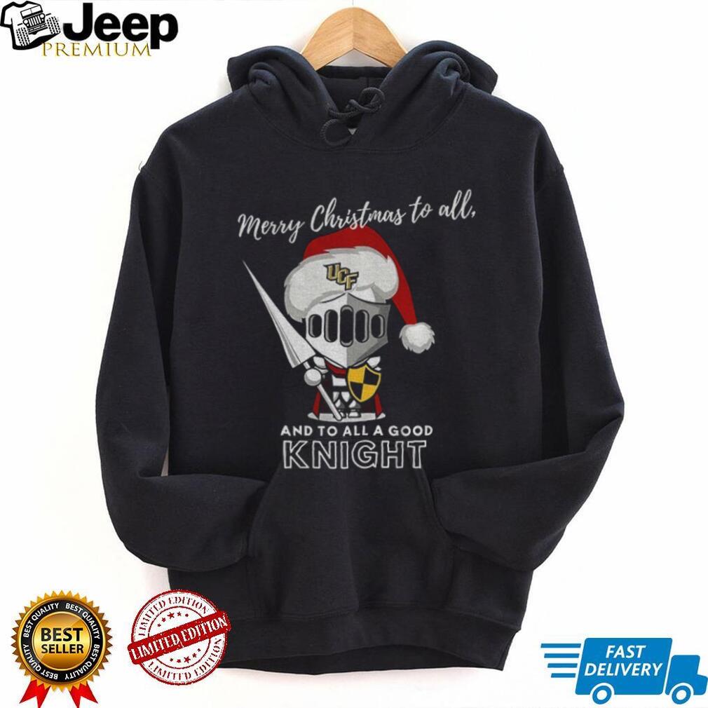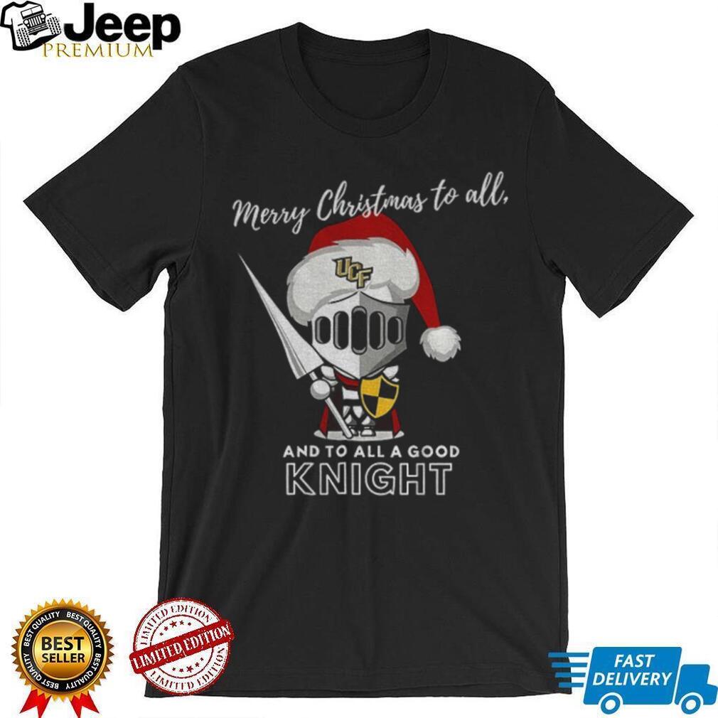 nThis UCF Knight Merry Christmas shirt stands out with its playful “Merry Christmas to all and to all a good knight” message, brilliantly integrating the UCF spirit into your holiday wardrobe. The design, featuring the UCF Knight logo with a festive Santa hat, is a conversation starter, making it easy to show off your school pride during the most wonderful time of the year. Made from a soft, breathable fabric, it ensures you stay comfortable whether you’re at a game or a holiday party. Available in various sizes, it offers a relaxed fit that’s perfect for everyone.n