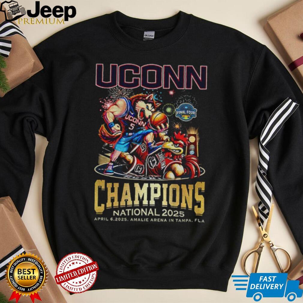 This “UConn Huskies defeats South Carolina 2025 NCAA Women’s basketball national champions shirt” will undoubtedly become a cherished 기념품 for UConn fans. It memorializes a specific and significant victory against a top-ranked opponent in the championship game. For fans who followed the Huskies’ journey throughout the 2025 season and the NCAA Tournament, this shirt serves as a tangible reminder of their team’s resilience, skill, and ultimate success in claiming the national title. It’s a proud declaration of their team’s achievement and a lasting memento of their championship-winning season.