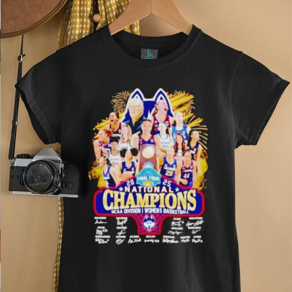 A “UConn Huskies women’s Final Four 2025 national champions signatures player firework shirt” is a highly celebratory piece of apparel commemorating the University of Connecticut Huskies women’s basketball team’s victory in the 2025 NCAA National Championship, achieved after navigating the Final Four. This unique shirt would likely combine several key elements: the official “National Champions” designation, the signatures of the championship-winning players, and a dynamic “firework” graphic symbolizing the explosive excitement of their victory. The inclusion of “Final Four” might subtly acknowledge the challenging journey to the title, emphasizing the significance of overcoming their final opponents to reach the pinnacle of collegiate success.