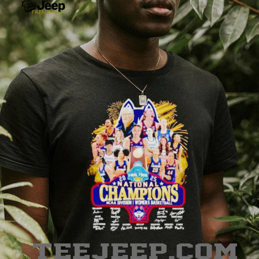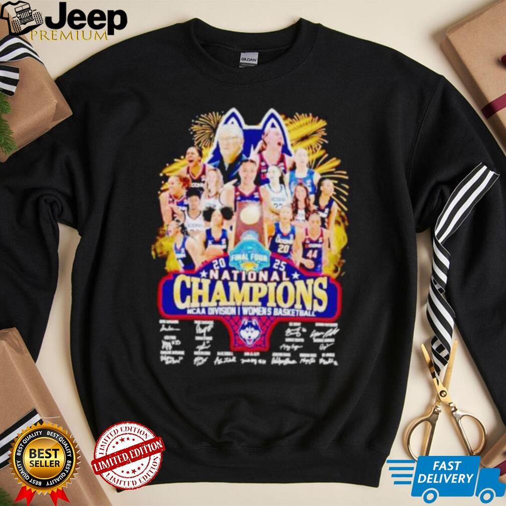 This “UConn Huskies women’s Final Four 2025 national champions signatures player firework shirt” will undoubtedly be a highly sought-after 기념품 for UConn women’s basketball enthusiasts. It encapsulates the ultimate success of the 2025 season, marked by their dominant performance in the Final Four and their championship-clinching victory. The combination of player signatures and the celebratory firework graphic makes this shirt a unique and cherished item, allowing fans to forever remember this specific team and their remarkable achievement in a visually exciting and personally meaningful way. It’s a testament to their skill, teamwork, and the explosive joy of becoming national champions.