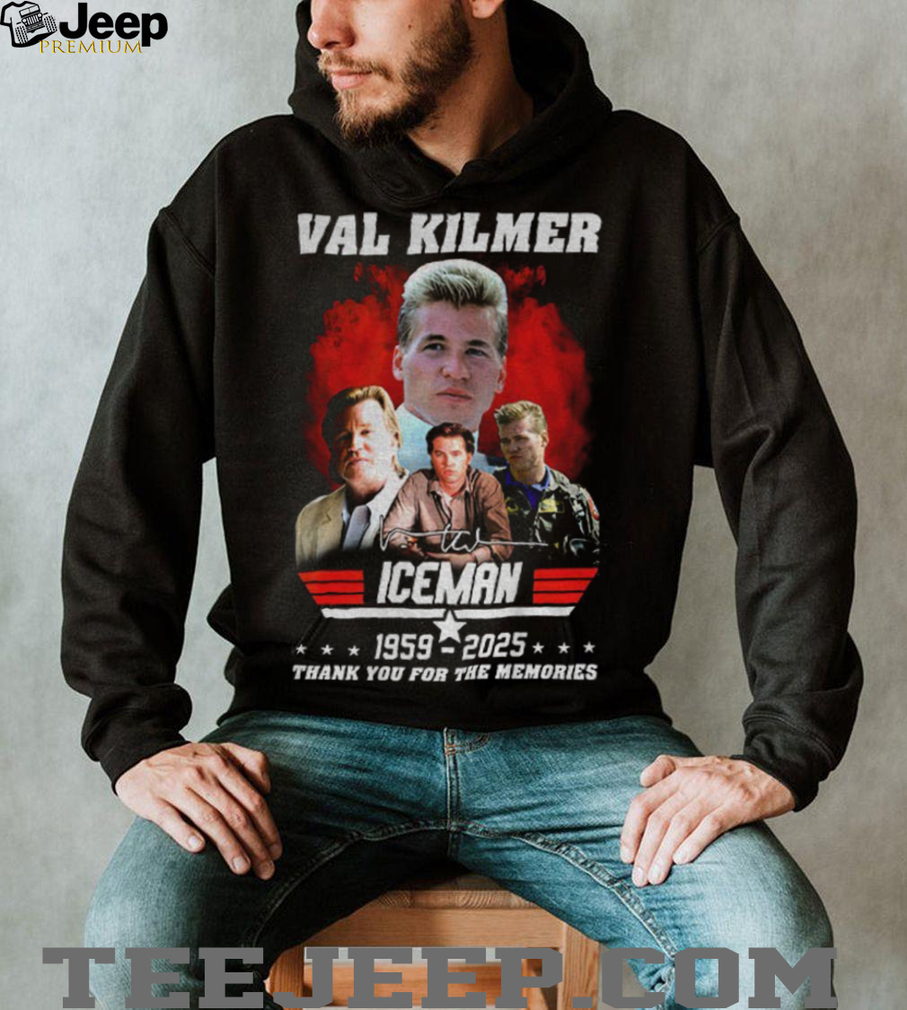 The “Val Kilmer Iceman 1959 2025 thank you for the memories signature shirt” is a piece of apparel that commemorates Val Kilmer, specifically his iconic role as Iceman in the “Top Gun” franchise. This shirt serves as a tribute to his career and a thank you to fans for their support, spanning from his birth year to a hypothetical future year. It likely features his signature, a common element in celebrity merchandise, along with imagery related to his Iceman role. The design prominently features Val Kilmer’s name, the Iceman character, years of birth and a future date, and his signature.