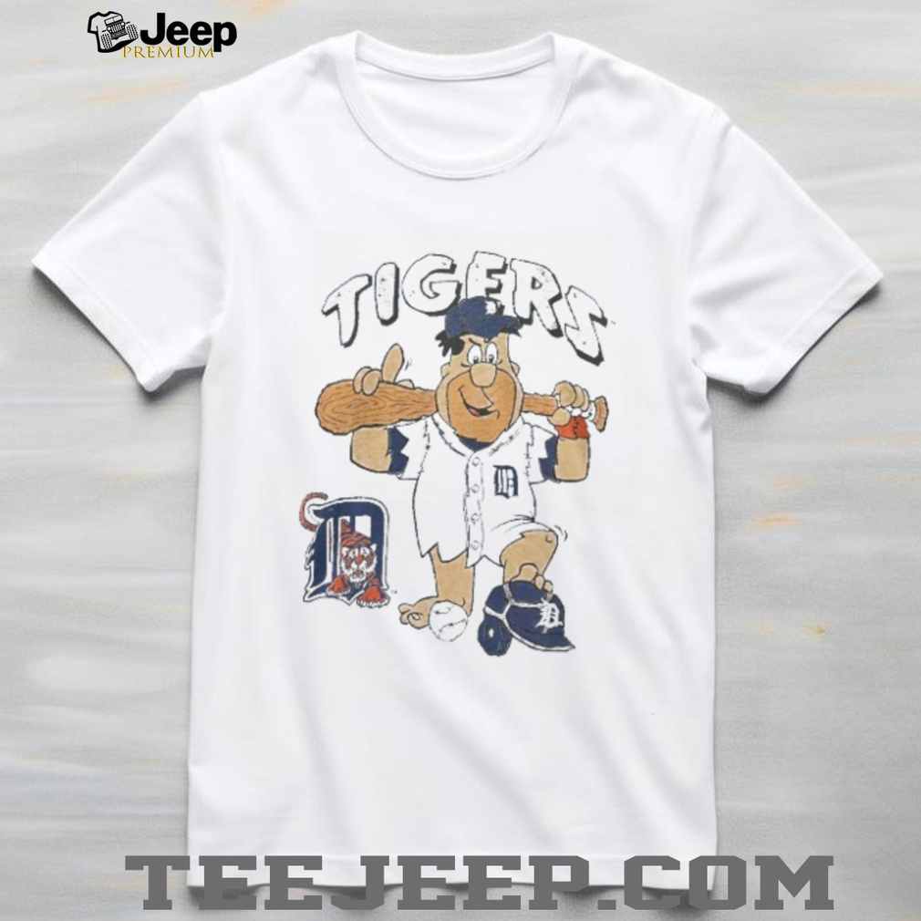 A delightfully nostalgic mashup of Detroit Tigers baseball and the classic Flintstones cartoon, featuring Barney Rubble in Tigers gear. This vintage-style graphic is perfect for fans of both the team and the beloved animated series. A charming retro piece that celebrates Detroit baseball through a Bedrock lens.