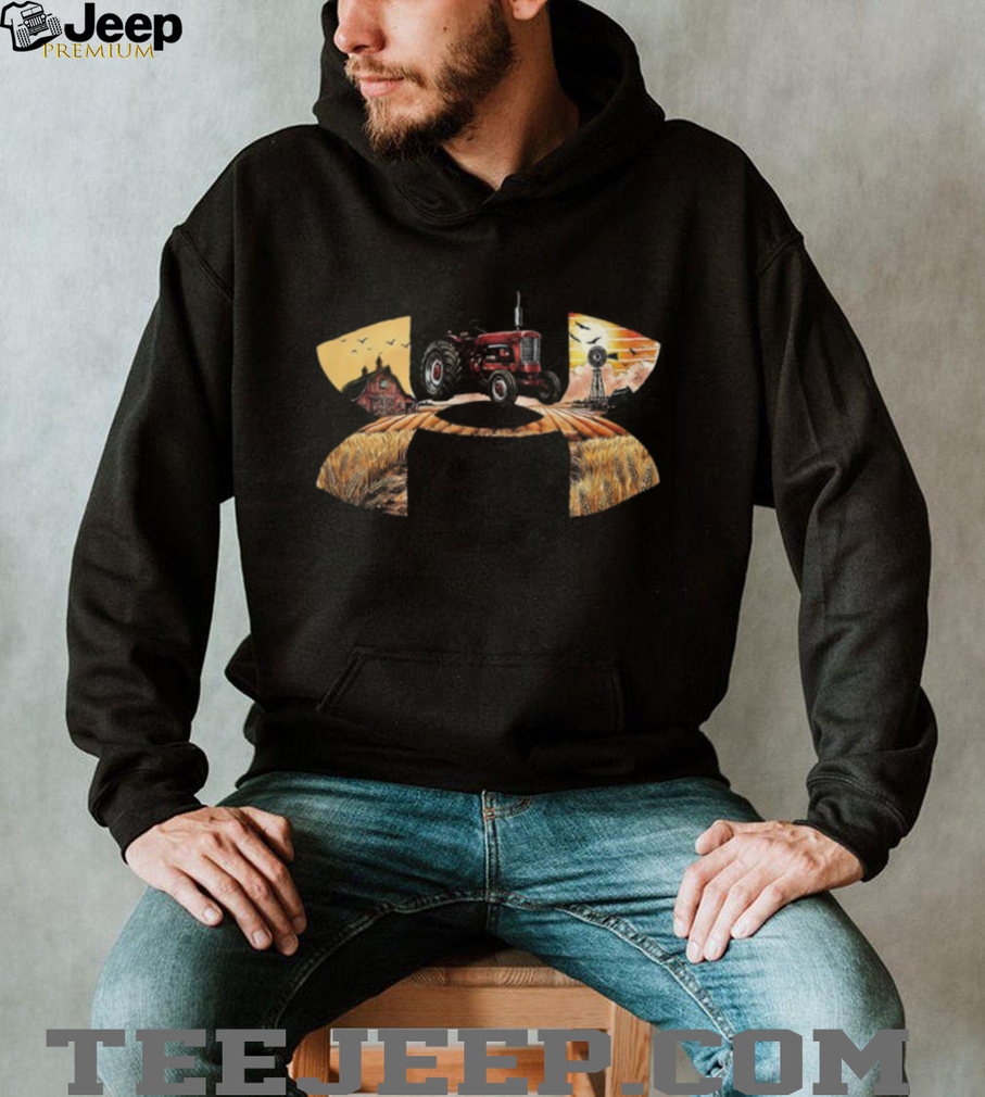 (Vintage Red Tractor Sunset Farm Life Landscape Logo Graphic T Shirt)