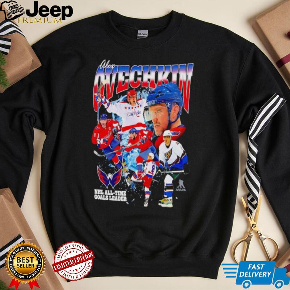 A “Washington Capitals Alexander Ovechkin NHL All Time Leading Goal Scorer Graphic shirt” commemorates the monumental achievement of Alexander Ovechkin becoming the NHL’s all-time leading regular season goal scorer on April 6, 2025, surpassing Wayne Gretzky’s previous record. This shirt would prominently feature Ovechkin’s name and the iconic moment he reached this milestone, likely incorporating a graphic that symbolizes his record-breaking goal count of 895 and potentially the Washington Capitals’ team logo. It serves as a tribute to his remarkable career, his unparalleled goal-scoring ability, and his lasting legacy in the National Hockey League.
