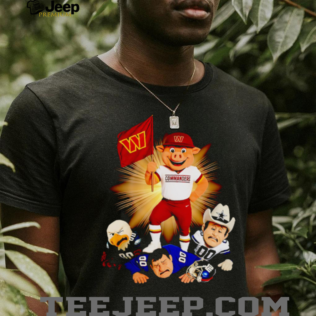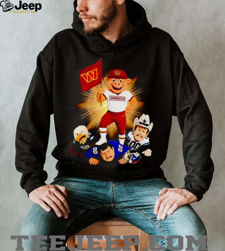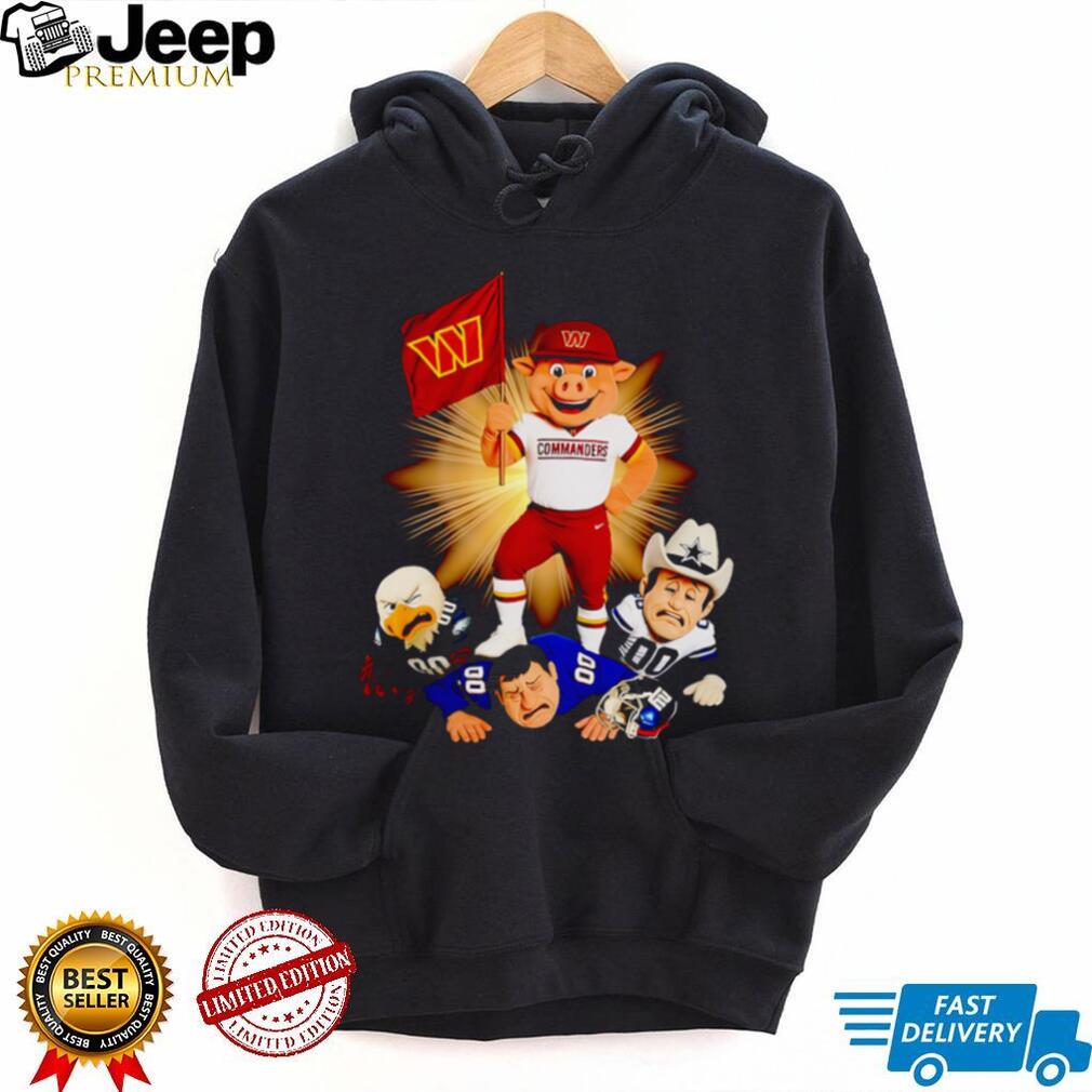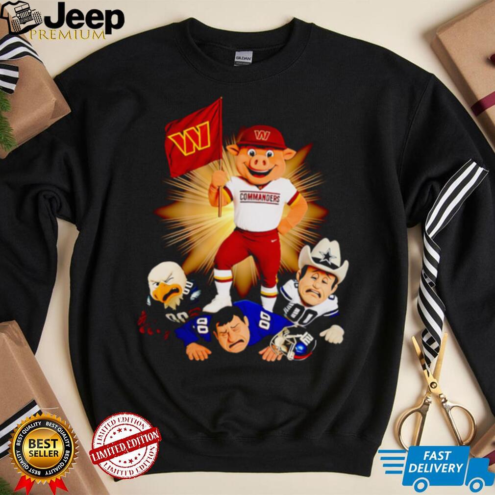 The “**Washington Commanders mascot**” depicted on this shirt is **Major Tuddy**, a prominent entity that officially debuted in January 2023. Major Tuddy, an anthropomorphic pig, is a clever and affectionate homage to “The Hogs,” the legendary offensive line of the Washington franchise during its dominant Super Bowl eras in the 1980s and early 1990s. This connection to a revered part of team history makes Major Tuddy a unique and rare attribute among NFL mascots, bridging the team’s past glories with its new identity as the **Washington Commanders**. The name “Tuddy” is football slang for “touchdown,” further reinforcing his connection to the game’s core excitement. Major Tuddy’s introduction was met with largely positive reactions from fans, who appreciated the nod to tradition during the team’s significant rebrand in 2022. This widespread acceptance provides social proof of his effectiveness in embodying the team’s spirit, as he engages crowds at FedEx Field and participates in community events. The design of this shirt, featuring Major Tuddy proudly standing, captures his jovial yet strong presence, which has become a viral trigger for renewed fan engagement. What happens next for the Commanders on the field is met with hope and the spirited antics of Major Tuddy, who, despite being new, already feels like a long-standing part of the Washington football family.
