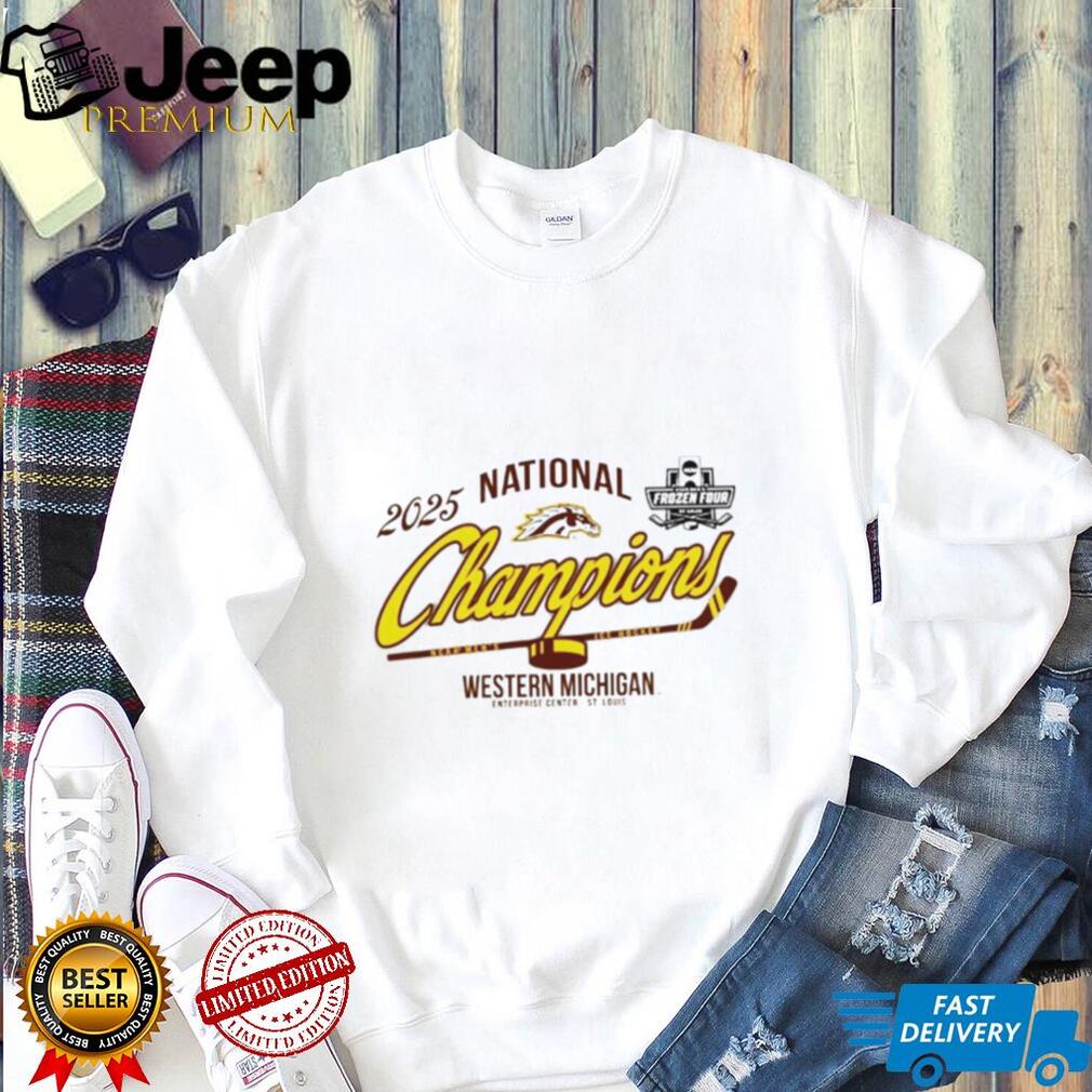 Forget complicated graphics or lengthy slogans. This shirt keeps it clean and impactful, likely featuring the official Western Michigan University logo proudly displayed alongside the prestigious “2025 National Champions” designation. It’s a timeless design that lets the iconic Bronco emblem share the spotlight with their historic achievement. Imagine the respectful nods from fellow hockey enthusiasts and the clear message you’ll send to rivals – the Broncos conquered, and here’s the logo to prove it! This isn’t just fabric; it’s a straightforward statement of championship pride.