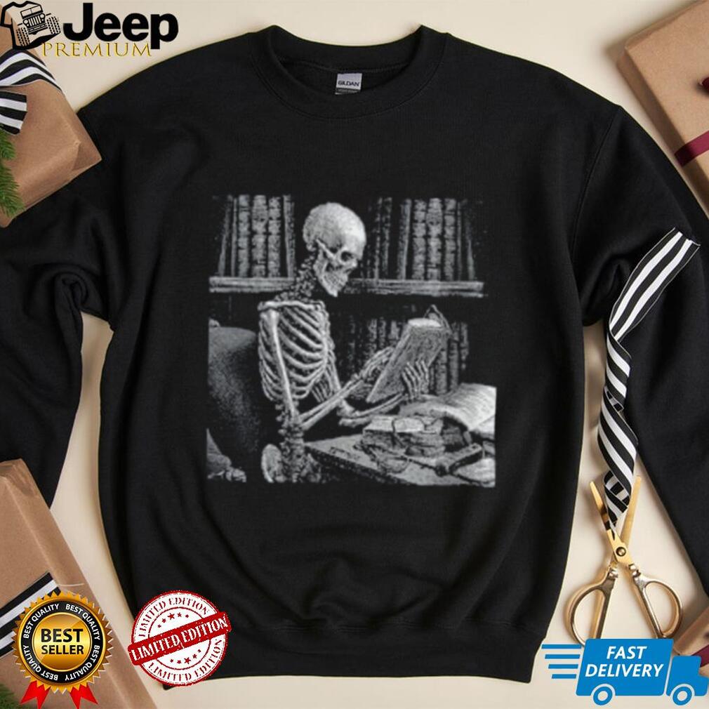 The central imagery of the “Womens Dark The Reader Skeleton Reading Book Bookworm Bookish V Neck Shirt” – the “skeleton reading book” – is rich with symbolic meaning. A skeleton, traditionally representing mortality or the remnants of life, is transformed into “The Reader,” a figure engrossed in eternal knowledge. This motif can evoke several interpretations: the idea that knowledge transcends life and death, that stories are timeless, or simply a humorous representation of how deeply a “bookworm” can become absorbed in a text, almost to the point of forgetting their own physical existence. This “dark” aesthetic often aligns with genres like gothic novels, mystery, and classic literature, where themes of life, death, and the pursuit of truth are common. My personal commentary: There’s something wonderfully whimsical about a skeleton lost in a book. It’s a playful acknowledgment that reading can be an all-consuming passion. It’s an emotional risk to embrace a slightly macabre aesthetic, but the charm and wit of this design are a powerful viral trigger, appealing to a specific subculture of readers. If you like to zoom in this way, you can almost see the glowing embers of an old library fire reflecting in the skeleton’s empty eye sockets.