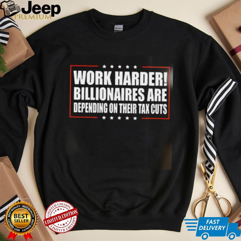 The “Work Harder Billionaires Are Depending On Their Tax Cuts Shirt” is a piece of apparel that uses satire to express a critical perspective on economic inequality and the effects of tax cuts for the wealthy. This shirt serves as a humorous yet pointed commentary on the perceived disparity between the working class and the ultra-rich. It’s designed to resonate with individuals who are concerned about income inequality, those who appreciate political satire, and people who use fashion as a form of social commentary. The design would prominently feature the phrase “Work Harder Billionaires Are Depending On Their Tax Cuts,” often in a bold or attention-grabbing font.