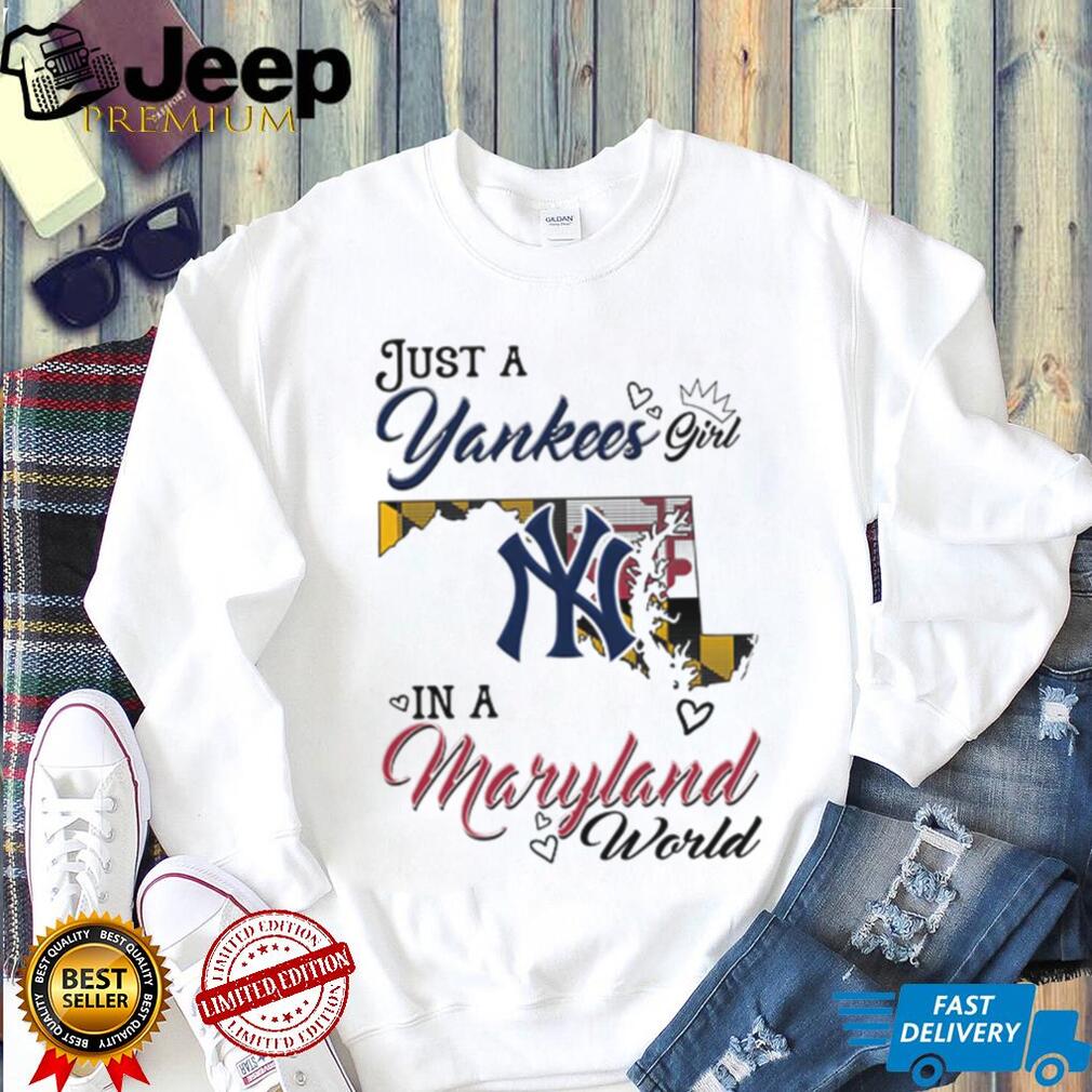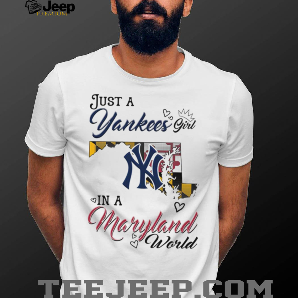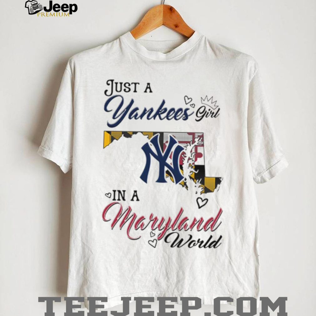 This unique Yankees Girl in a Maryland World shirt is ideal for female New York Yankees supporters residing in Maryland. It makes a fantastic gift for birthdays, holidays, or any occasion to celebrate a friend or family member who proudly boasts their Yankees spirit in the Old Line State. It’s perfect for casual wear, local sports events, or watch parties, helping you connect with fellow fans (and perhaps playfully tease rivals!).